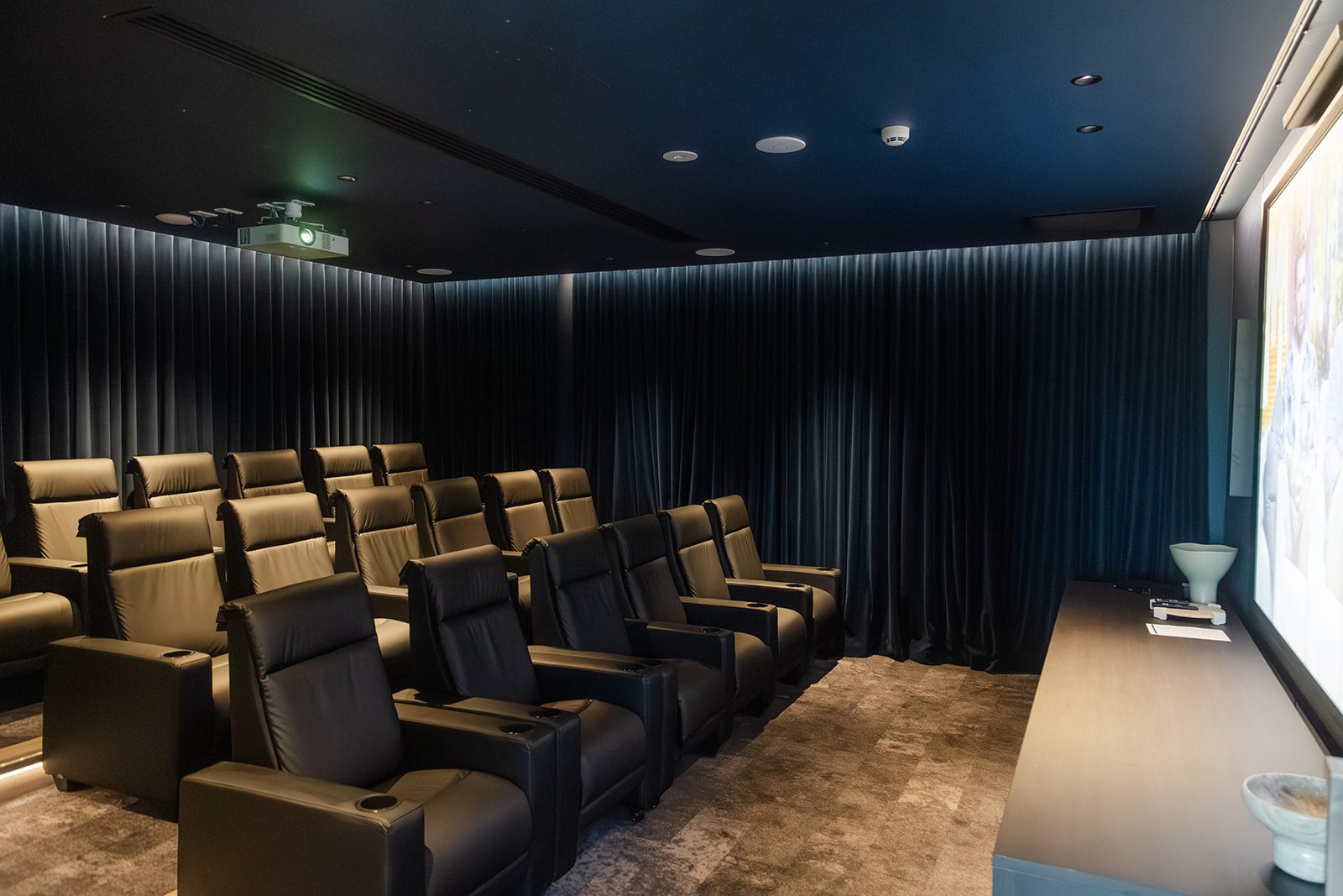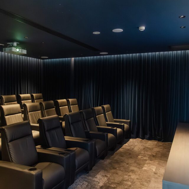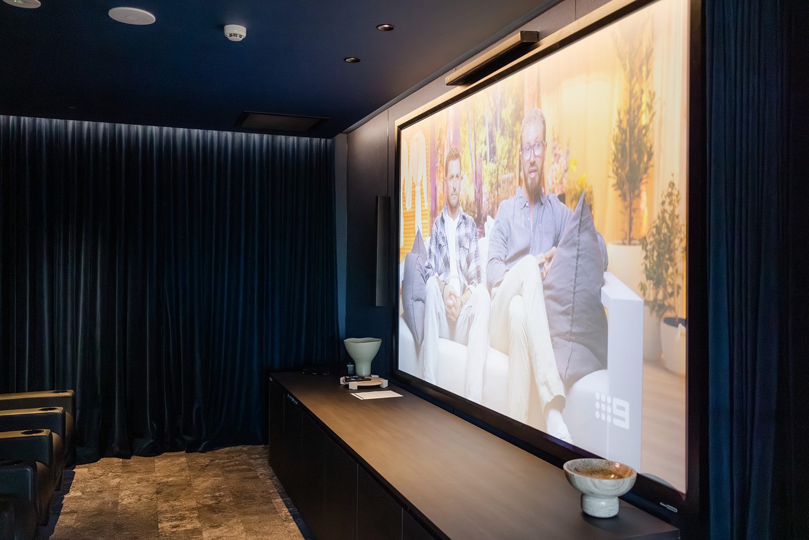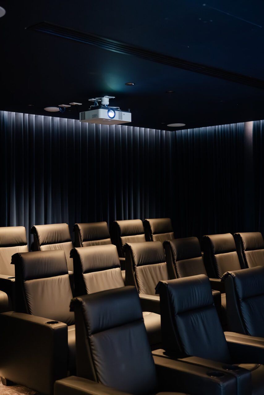An intuitive Crestron interface provides simple power control and source selection. The acoustically transparent screen preserves accurate audio localisation from the front channels and centre speaker. A future-ready cabling layout with spare pathways and labelled terminations enables easy additions, such as streaming sources, accessibility aids, or presentation inputs. Wireless hearing augmentation ensures inclusive access for residents and guests.