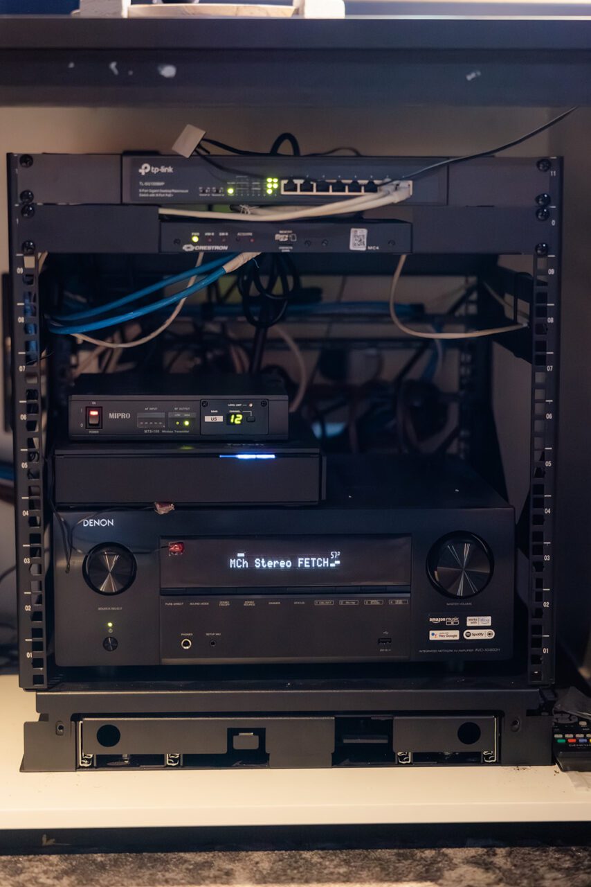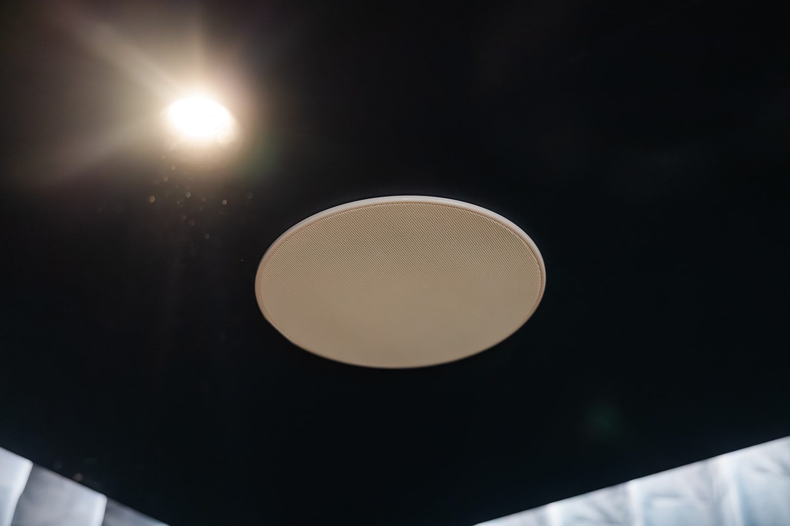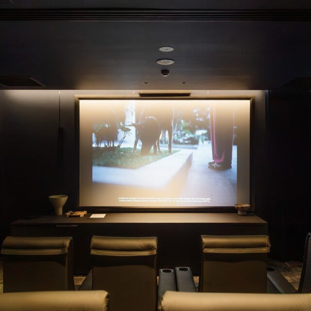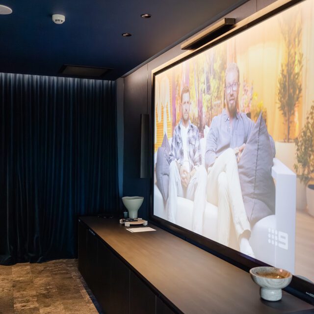 An intuitive Crestron interface provides simple power control and source selection. The acoustically transparent screen preserves accurate audio localisation from the front channels and centre speaker. A future-ready cabling layout with spare pathways and labelled terminations enables easy additions, such as streaming sources, accessibility aids, or presentation inputs. Wireless hearing augmentation ensures inclusive access for residents and guests.